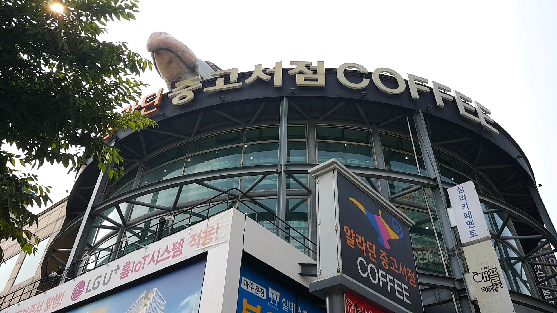 둥그런 형태의 건물에 통유리로 된 서점 내부가 인상적입니다. 더불어 요즘 알라딘 중고서점 여러 곳에 선보이고 있는 음료 매장도 입점하고 있어, 책을 읽고 구경하며 시간을 보내기 좋습니다.