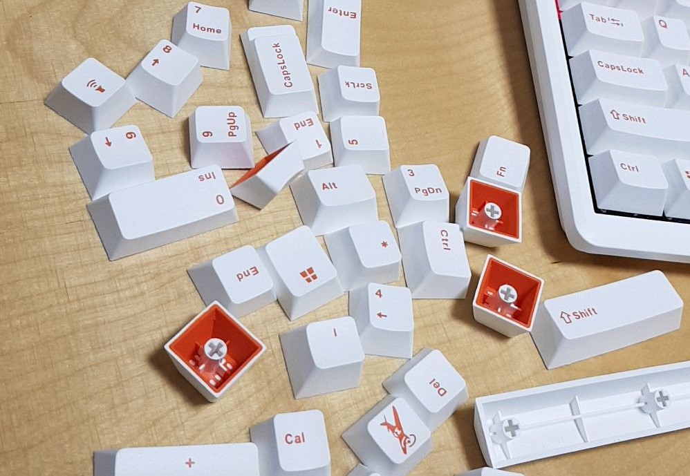 키보드 자체도 기계식인 체리 MX 스위치로 타이핑감도 나쁘지 않습니다. 개인적으로 적축을 선호하는지라 적축으로 골랐습니다. 키캡은 PBT 이중사출 방식에다 스텝스컬처 2를 지원하는 만큼 싸 보이지 않고 나름 고급스럽습니다. 여기에 여분 키캡도 넉넉하게 지원해서 제품 개봉 시 만족스러웠습니다.