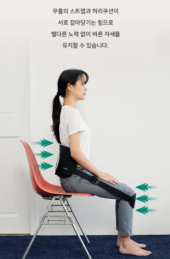 허리를 지지하는 쿠션과 무릎을 지지하는 보호대, 그리고 이러한 지지점을 연결하고 당겨주는 밴드로 구성됐다.