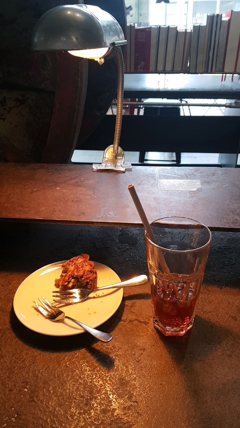 저는 업무 출장길에 잠시 들러 시원한 커피와 호두 파이를 먹었습니다.