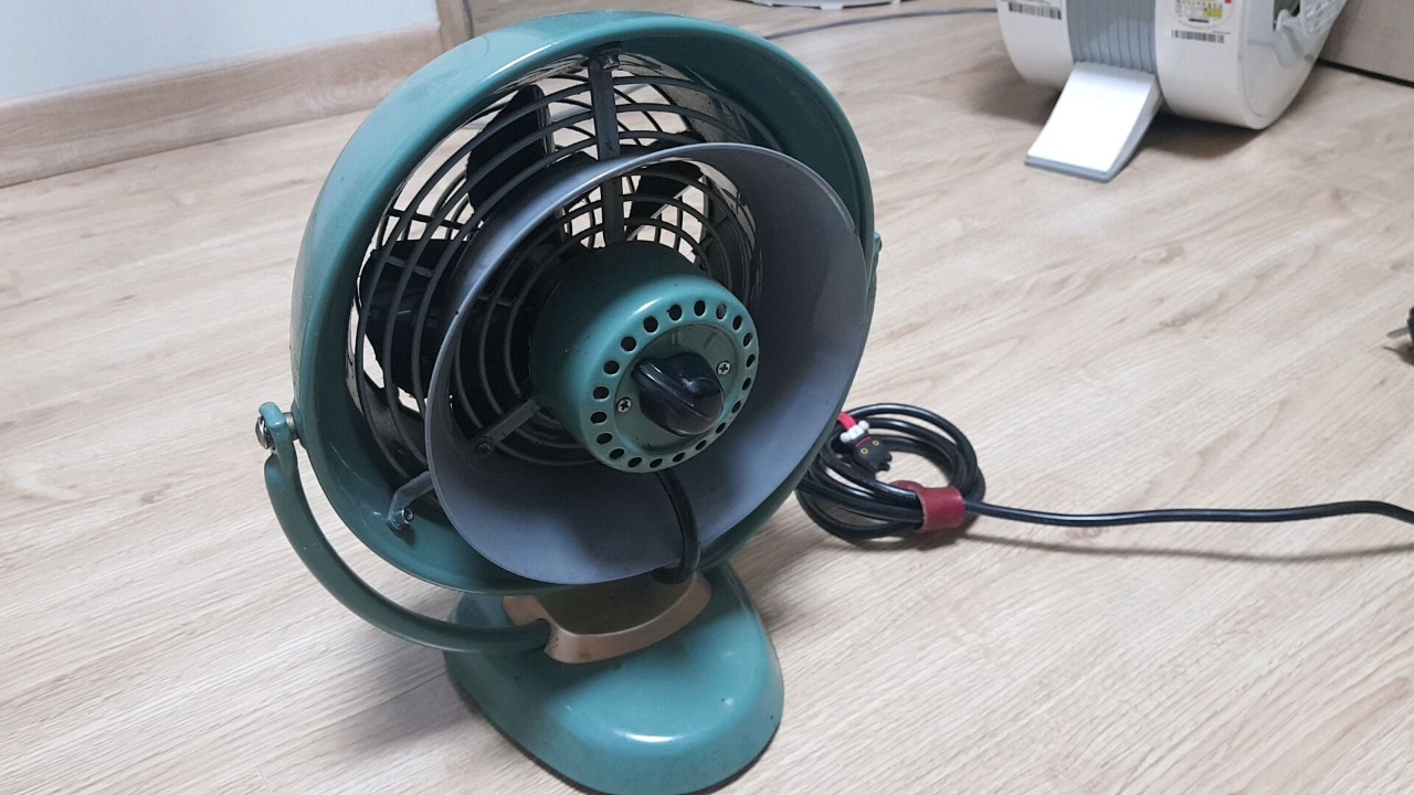 색상은 블루, 화이트, 그린, 크로뮴(크롬) 등이 있는데 저희 집 제품은 그린 제품입니다. 그린 제품은 팬이 검은색에, 서큘레이터 망은 황동색입니다.