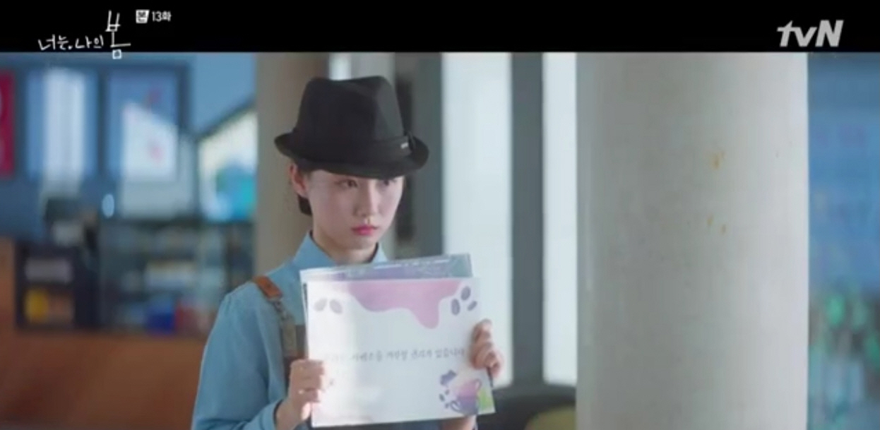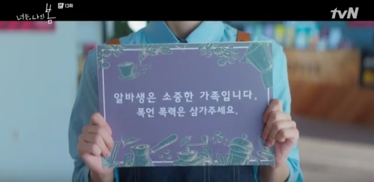 여기서 다짜고짜 반말 시전과 함께 물을 갖다 달라는 건물주에게 초면인 '아리'는 종업원에게 반말 등 실례되는 행동을 삼가 달라는 손팻말을 들고 나타납니다. 극 중 나온 손팻말 중 '삼가다'와 관련해 잘못된 활용 사례가 나와 이번 '드라마·영화가 틀린 맞춤법' 첫 사례로 선택했습니다.
