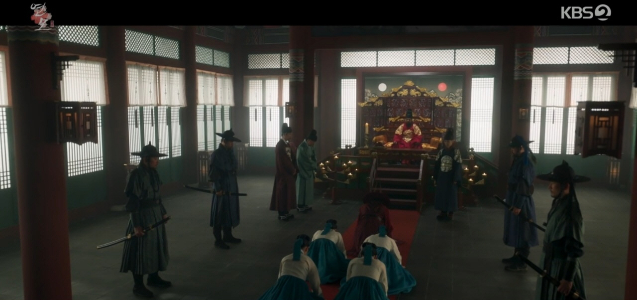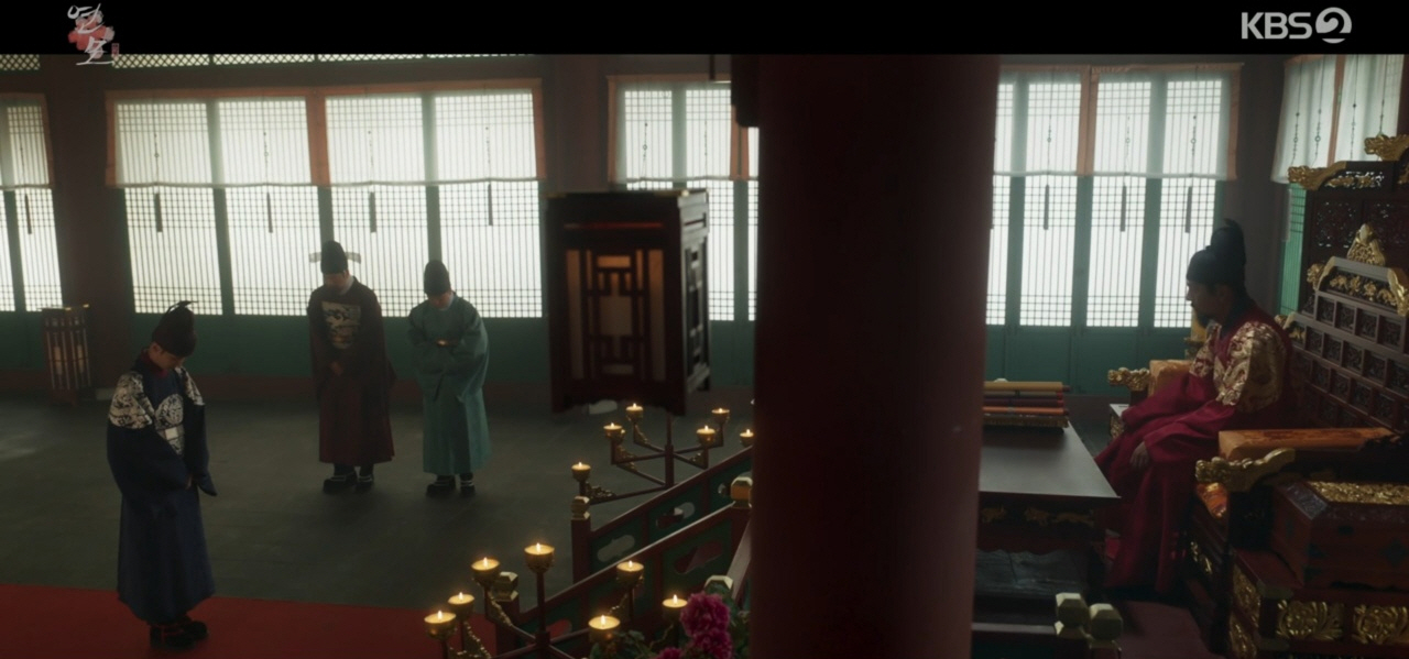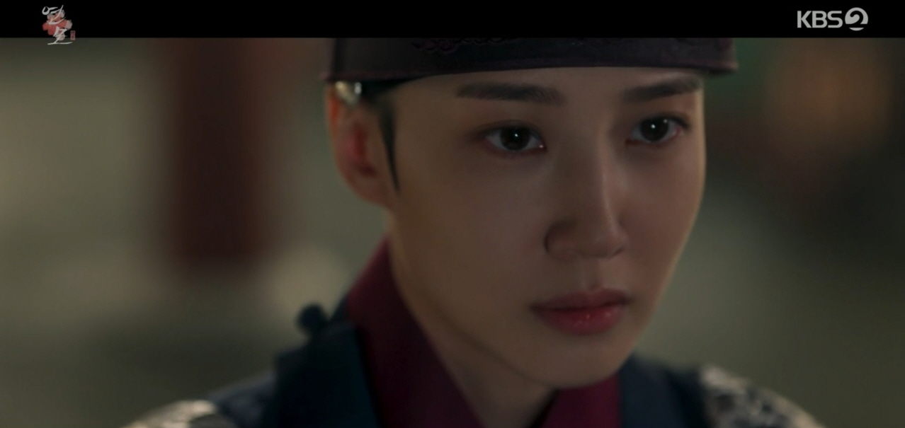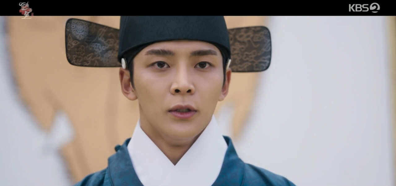 왕: 한 나라의 세자라는 자가 허락도 없이 궐 밖에 나간 것도 모자라 기루나 어슬렁거렸다. 참으로 답답하고 어리석구나. 정무가 바쁘다. 그만 물러가라.