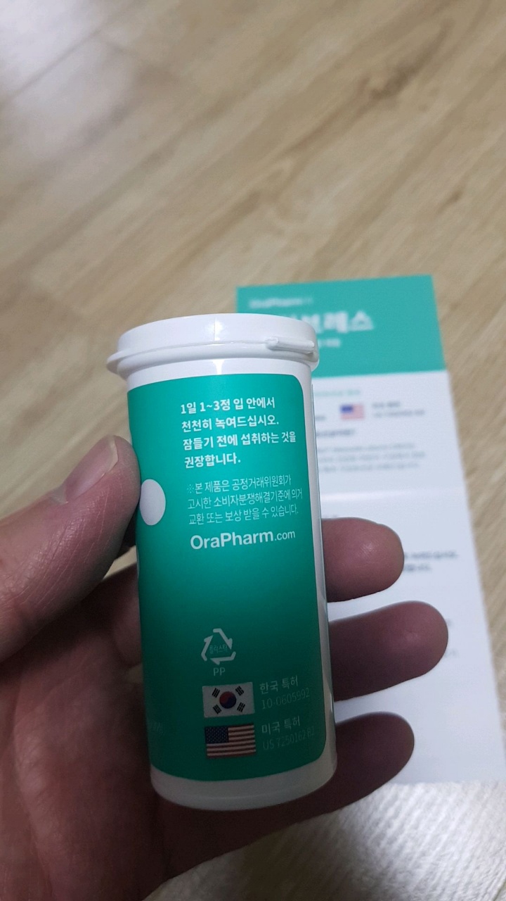 복용은 그냥 사탕처럼 입안에서 녹여서 먹는 방식입니다. 원통형 포장에는 1일 1~3정을 입안에서 천천히 녹여서 먹으라고 쓰여있습니다. 덧붙여 잠들기 전에 섭취하는 것을 권장한다고 돼 있습니다. 특히, 구강 유산균은 유익균이 잘 증식할 수 있도록 복용 후에는 음식물이나 물을 당분간 먹지 않아야 합니다. 따라서 밤에 양치질을 끝내고 수면에 들기 전에 복용하는 게 가장 좋습니다.