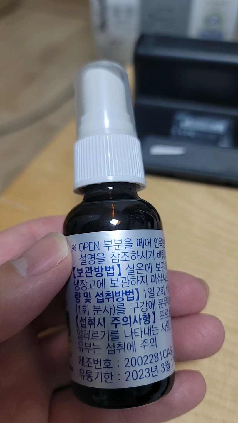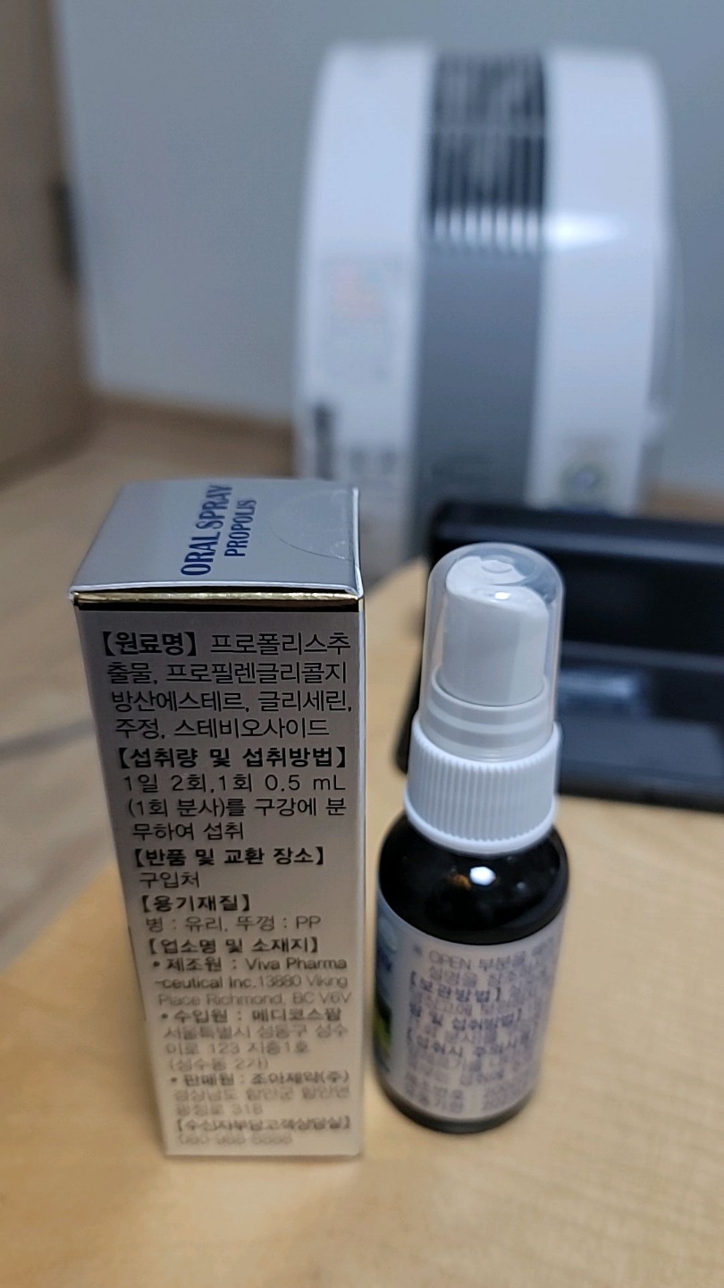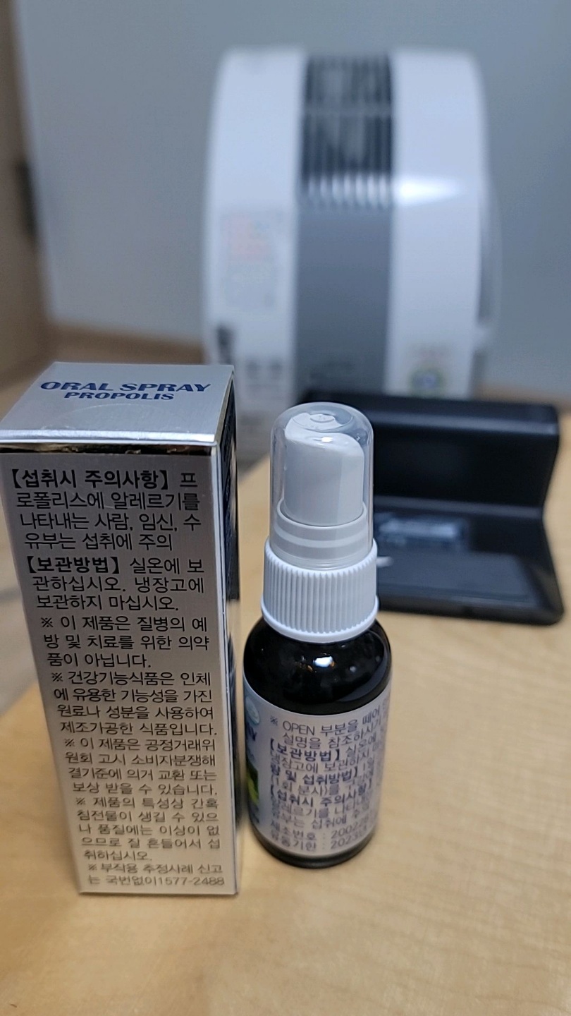 조아제약의 프로폴리스 오랄 스프레이 제품은 항산화 및 구강에서의 항균 작용에 도움을 주는 제품입니다. 1일 2회 구강에 직접 분무하여 섭취하도록 돼 있습니다. 저는 집에 놓고 아침에 출근하면서 한 번, 저녁에 자기 전에 한 번 이렇게 두 번을 사용하고 있습니다.