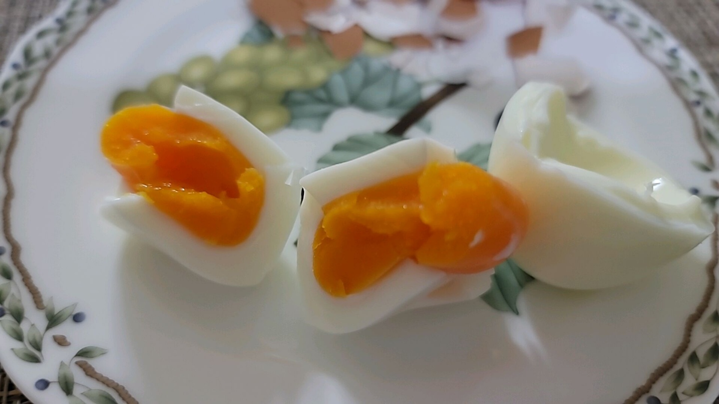 반숙란 껍질을 잘 까고, 반으로 갈라 봅니다. 알맞게 반숙이 됐네요. 편의점 반숙란의 경우 껍질을 벗기다 보면 계란 흰자가 같이 뭉터기로 떨어져 나가 속이 상할 때가 많았습니다. 여기 제품은 편의점 반숙란보다 그런 불편함이 훨씬 덜합니다.