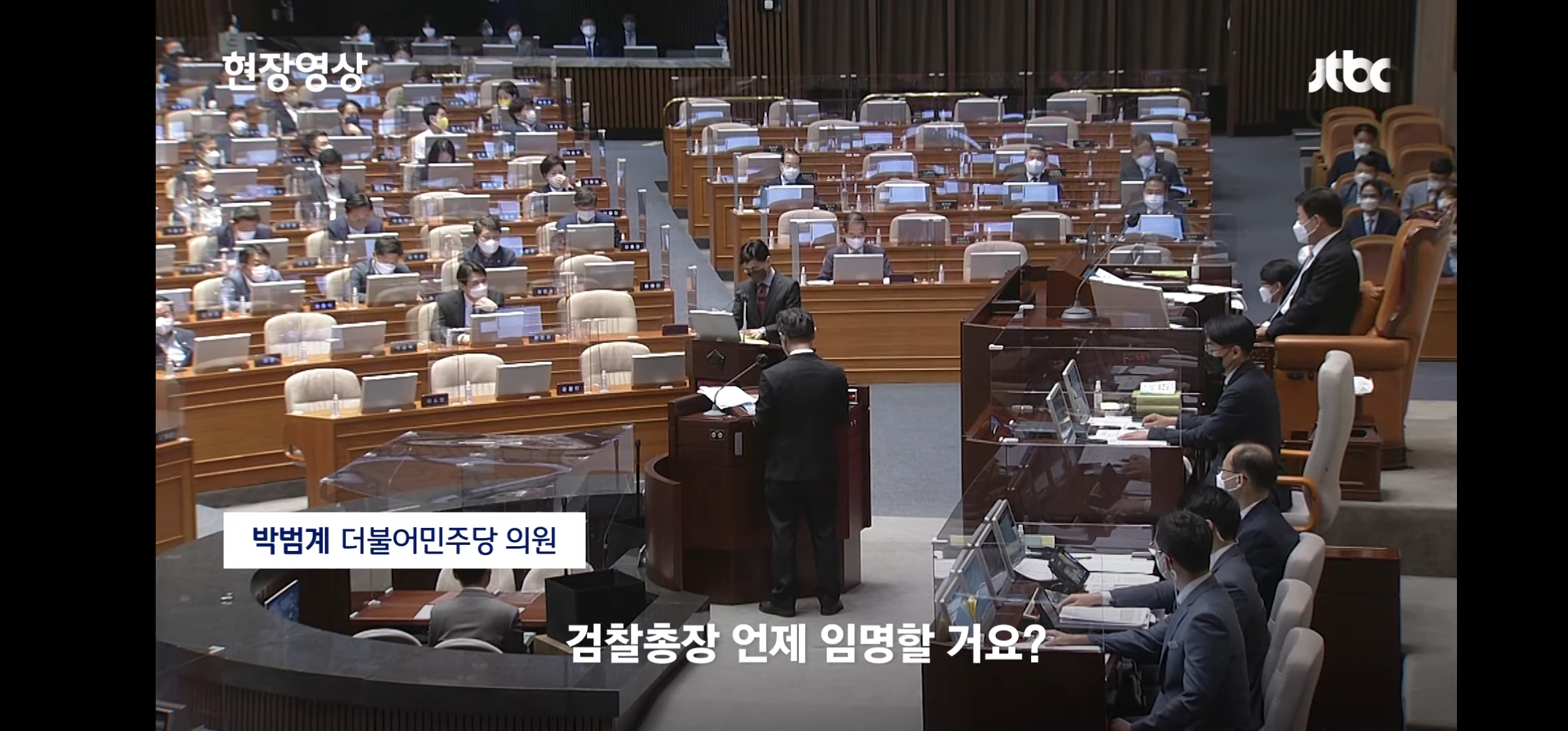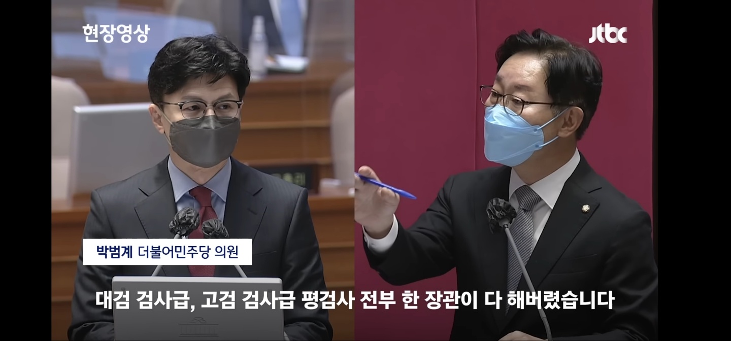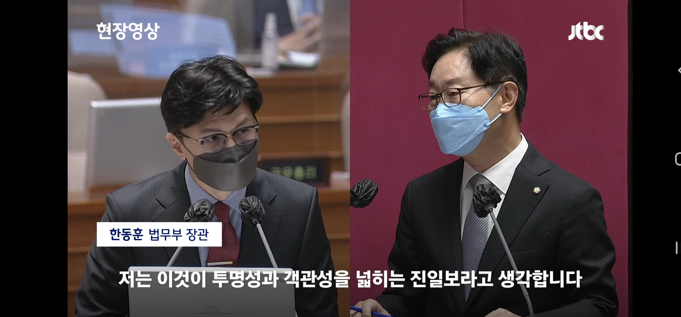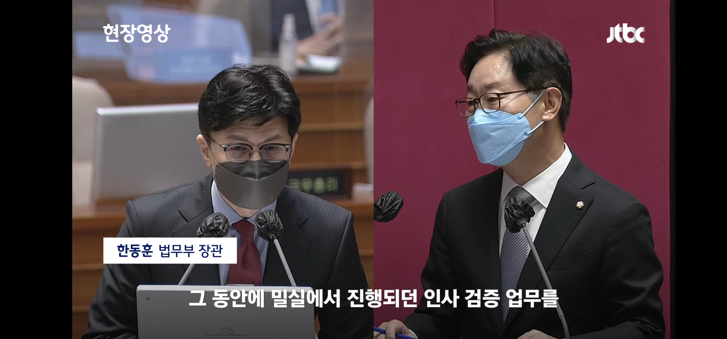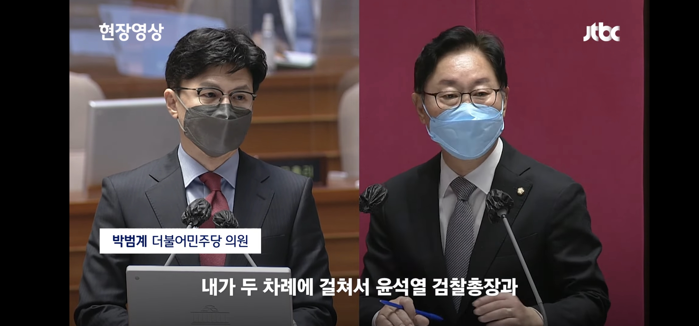 오늘은 JTBC 뉴스와 SBS 뉴스에서 가져왔는데요. 전 법무부 장관이었던 박범계 의원과 현 법무부 장관인 한동훈 장관이 검찰총장 없이 이뤄진 검찰의 인사, 그리고 법무부 장관의 정부 고위직 인사 검증의 적법성과 관련해서 '설전'을 벌인 내용입니다.