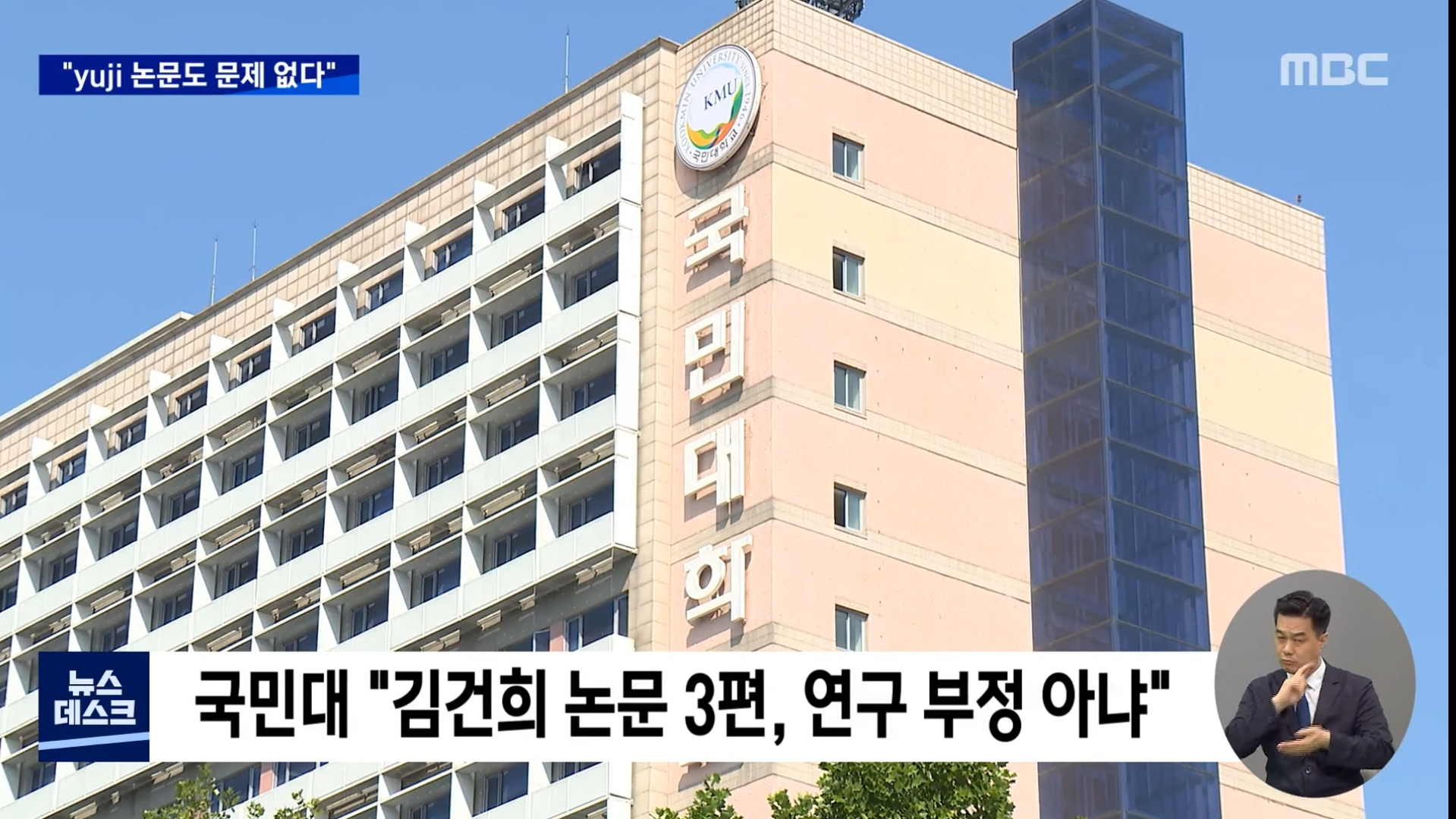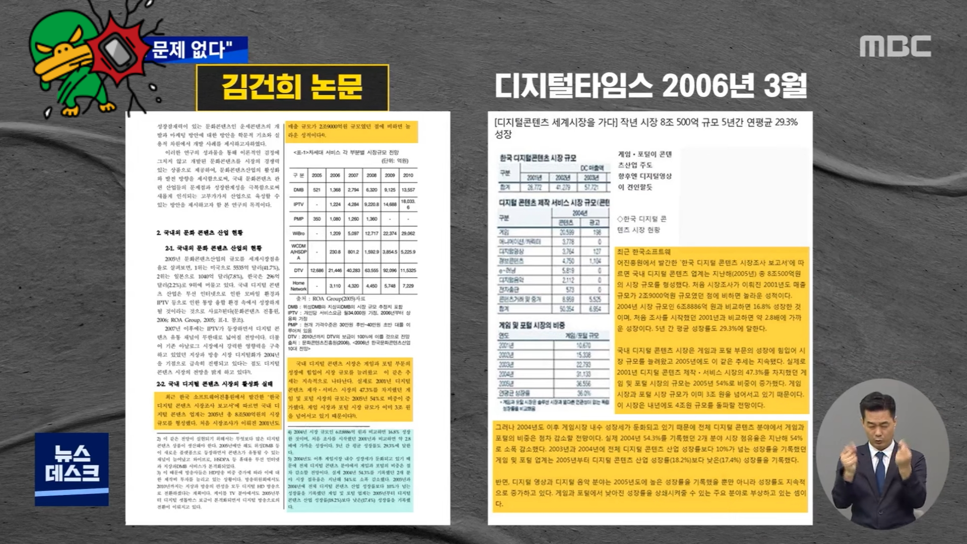 MBC 뉴스 화면에서는 또 아래 뉴스 해설 자막에서는 "2008년 박사학위 논문도 연구윤리 문제없어", "논문 3편 '문제없다'.. 1편은 '검증 불가'"와 같이 '문제없다(문제없이)'라는 하나의 단어로 된 형용사를 문법에 맞게 쓰고 있습니다.