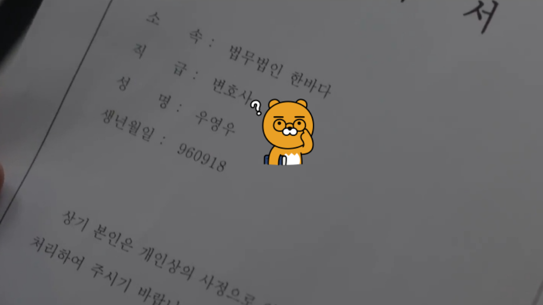 자, 우선 첫 번째 사례입니다. 우영우가 사직서를 낸 장면인데요. 바로 이 사직서에 나오는 쌍점(:)이 문제입니다.