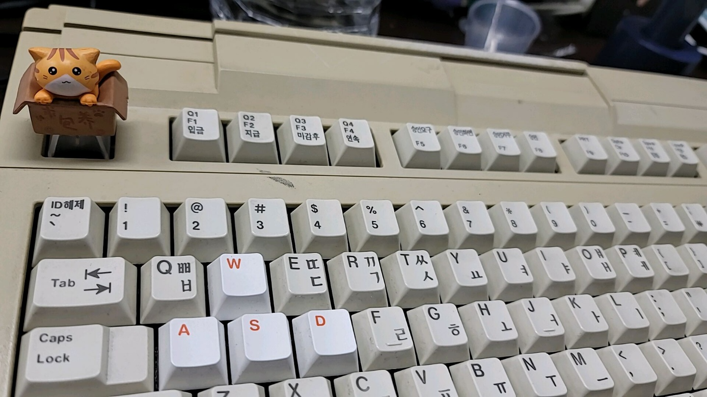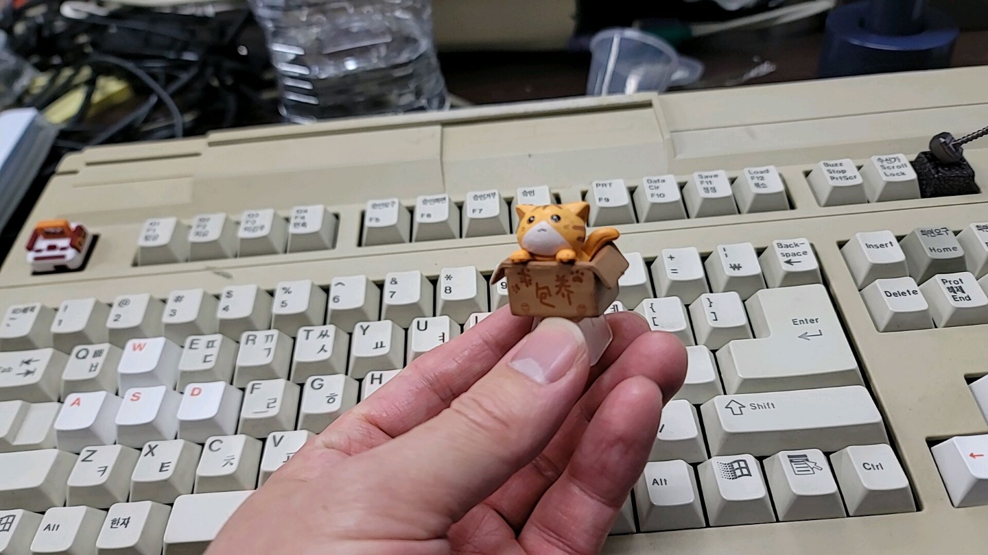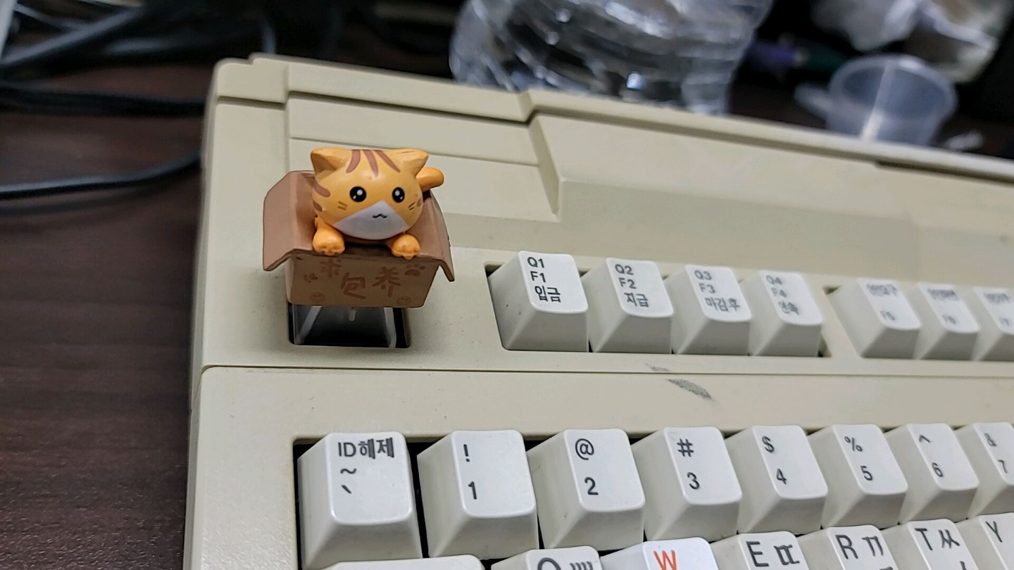 그렇다 보니 보통 키캡 놀이는 ESC나 Pause, Scroll lock, PrtScr 같은 잘 사용하지 않는 키캡에 많이들 합니다. 저도 마찬가지이고요. 특히, 이 고양이 상자 키캡은 워낙 도드라져 있다 보니 대표적인 키캡 놀이용 키인 ESC 말고는 어디다 가져다 놓기도 애매하네요. ㅎ