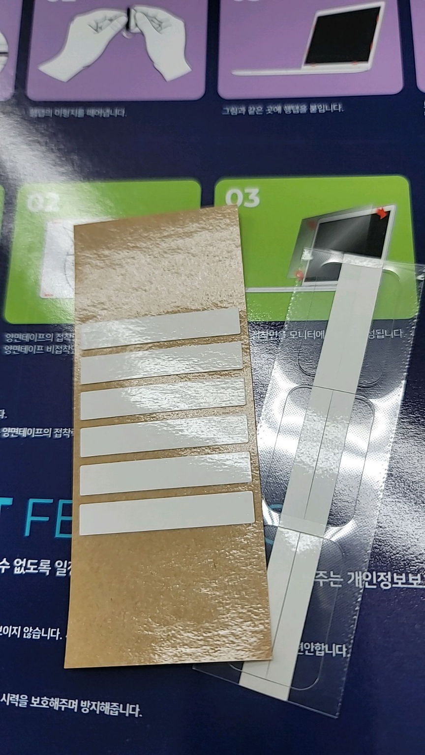사생활 보호 필름은 양면테이프를 이용해 붙이거나 또는 행탭(거치용 스티커가 붙은 플라스틱)을 이용해 거치할 수 있도록 돼 있습니다. 저는 행탭을 이용해 거치하고, 필요에 따라서는 보호필름을 제거하는 방법으로 사생활 보호필름을 사용합니다.