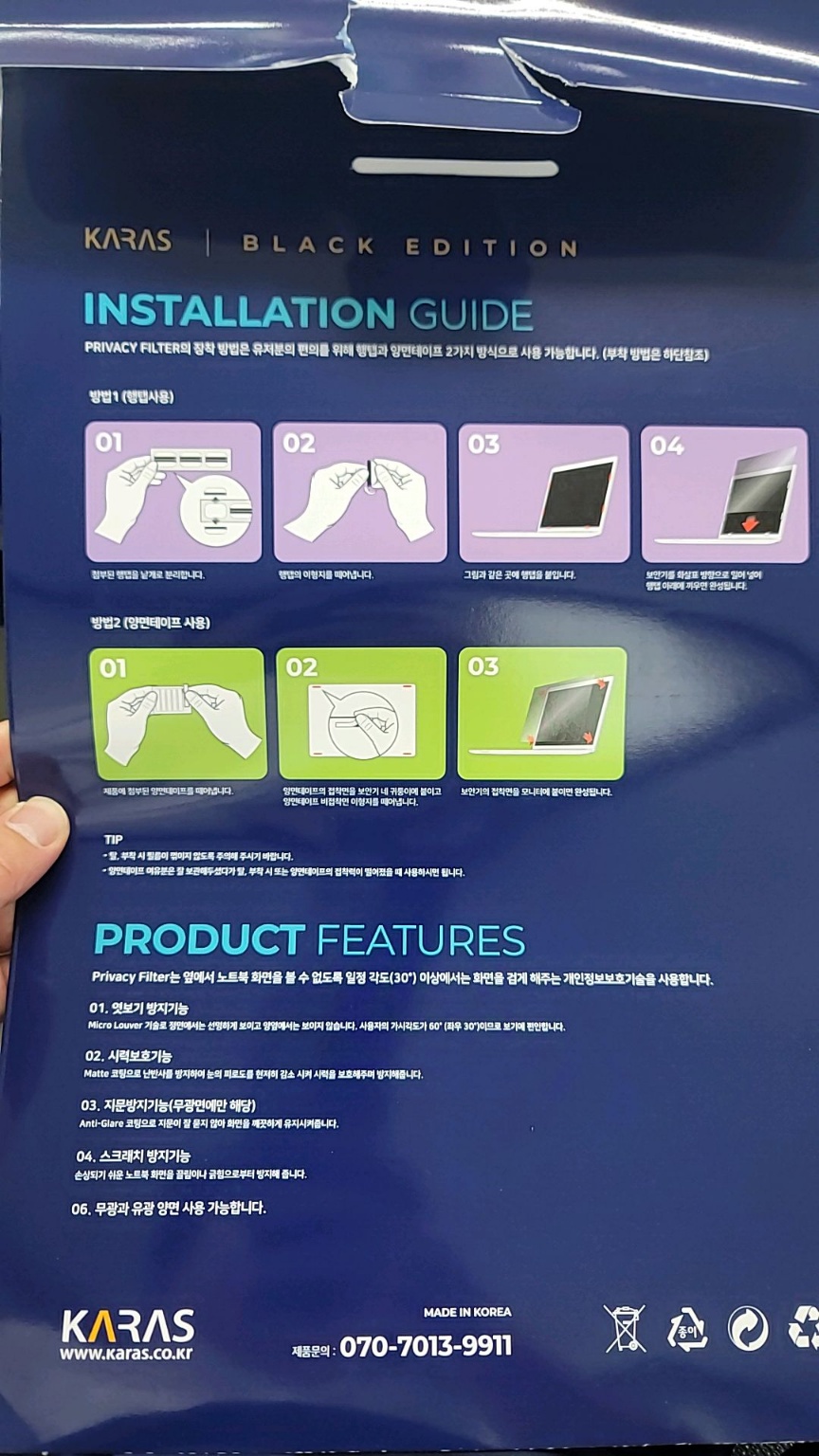 제가 구매한 제품은 사생활 보호 필름인 만큼 엿보기 방지 기능을 바탕으로, 시력 보호 기능, 지문 방지 기능(무광 면에만 해당), 스크래치 방지 기능 등이 있다고 안내돼 있습니다. 또한, 무광 면과 유광 면으로 나뉘어 있어 기호에 따라 선택해 사용할 수 있습니다.